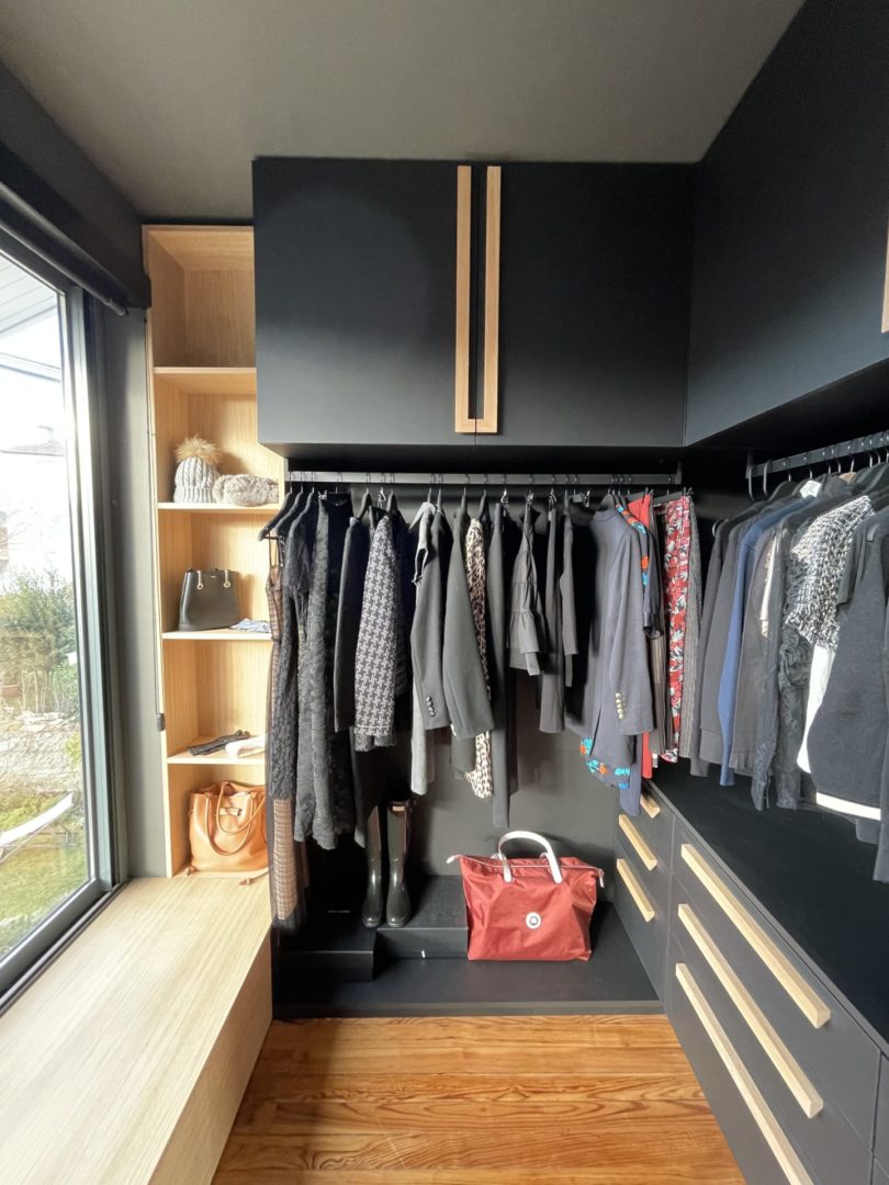 Nuances & Perspectives a imaginé un dressing sur mesure avec des rangements fonctionnels et astucieux qui encadrent une grande fenêtre, sans perdre en luminosité. Cet aménagement a permis d’organiser au mieux la garde-robe de nos clients tout en s’adaptant à la forme de la pièce.