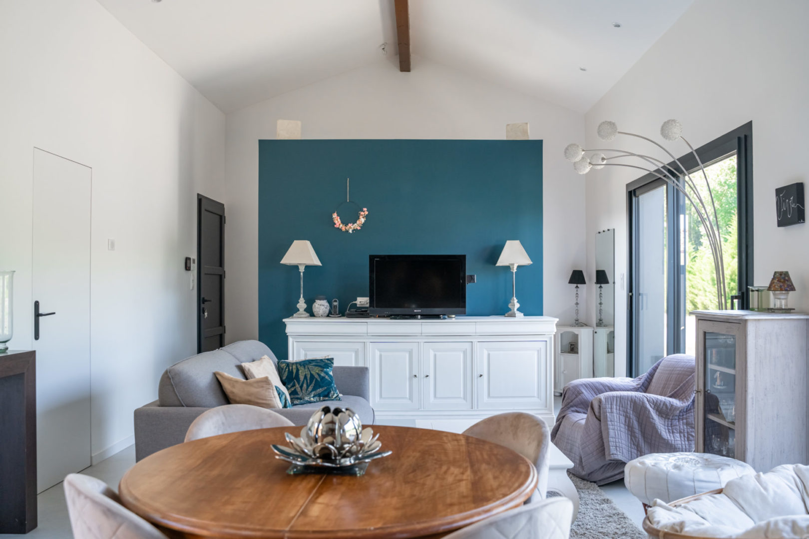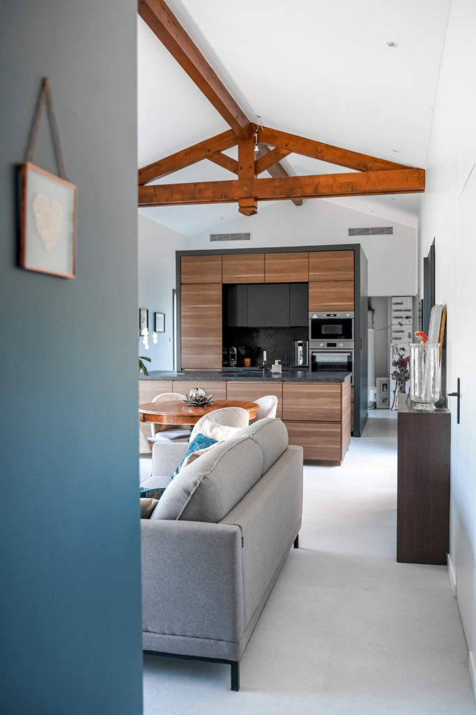 Projet : Construction complète d’une maison en ossature bois. L’architecture de la maison a été réalisée par le cabinet Boomerang & Macadam et l’intérieur aménagé par Nuances & Perspectives. Les clients souhaitaient une maison de plein pied, comprenant une grande pièce de vie lumineuse et ouverte sur l’extérieur. La hauteur sous plafond avec poutre apparentes donne à la pièce de la grandeur. Deux cubes servent à séparer les espaces. Le premier cube sert d’un côté d’entrée, avec un grand dressing et de l’autre côté de mur pour l’espace salon. Le deuxième cube comprend la cuisine ouverte donnant sur le séjour, un cellier et un WC donnant sur l’arrière.