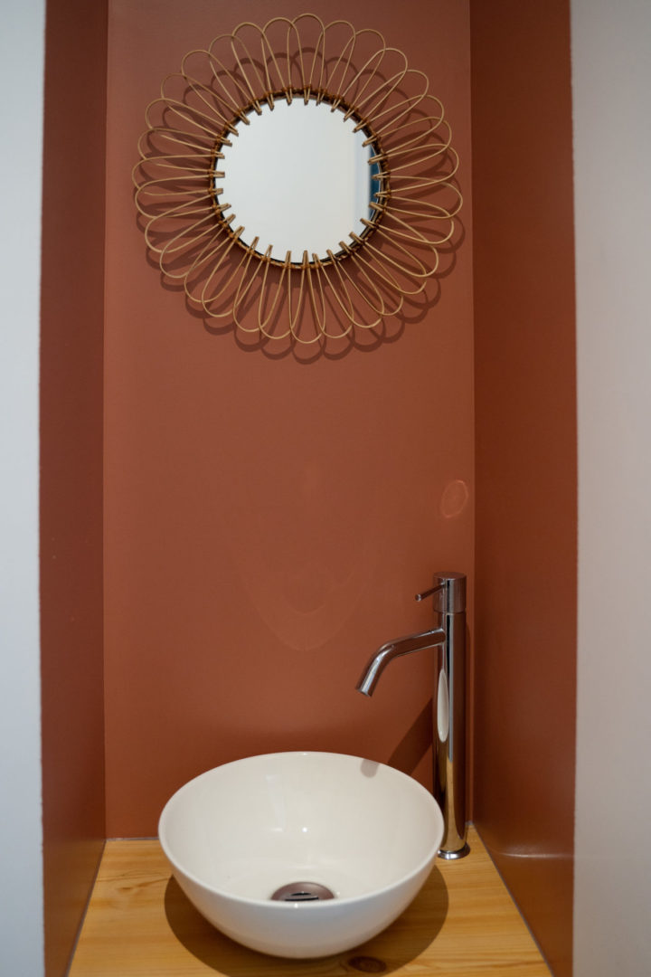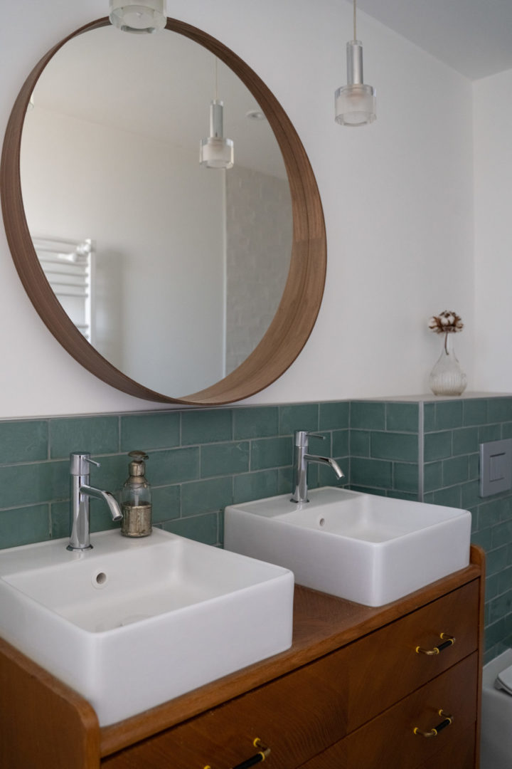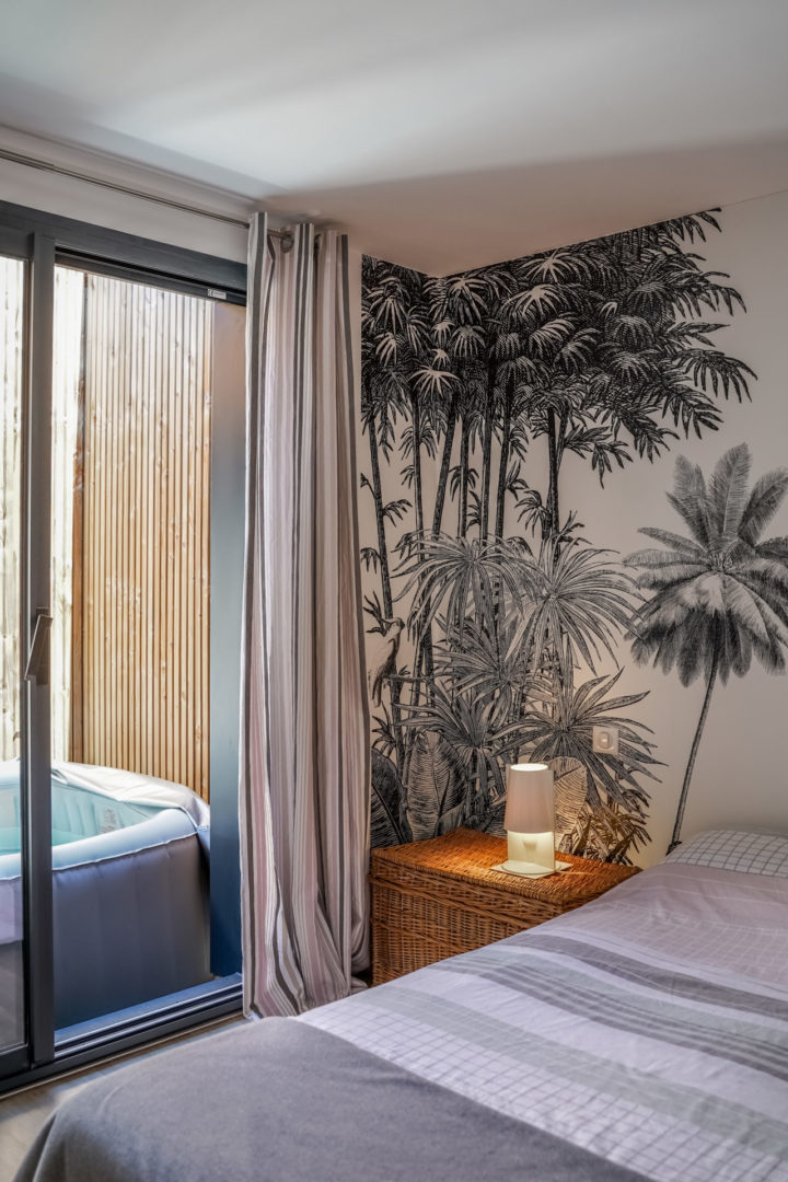 Informations matériaux: les façades de la maison sont en bardage bois vertical à claire-voie, d’essence locale (pin), le sol de la pièce de vie grand carreaux de PVC imitation béton ciré, la peinture des deux cubes dans la pièce principale est la SL25 Minuit de chez Ressource en collaboration avec Maison Sarah Lavoine, cuisine IKEA, robinetterie et vasques des pièces d’eau Leroy Merlin, peinture WC et deuxième chambre Unikalo C64 de chez Farrow & Ball. Papier peint panoramique noir et blanc Maison du monde. Carrelage au sol de la salle de bain CE.SI de chez WENDEL posé façon chevron et aux murs carrelage imitation zelige de chez Leroy Merlin, la peinture SL33 Eucalyptus de chez Ressource en collaboration avec la Maison Sarah Lavoine. La peinture de la suite parentale est la SL05 Amande toujours de chez Ressource en collaboration avec la Maison Sarah Lavoine. Dans la salle d’eau, le carrelage au sol vient de chez Saloni et la faïence de chez Leroy Merlin. La faïence de la cuisine vient de chez Saloni.